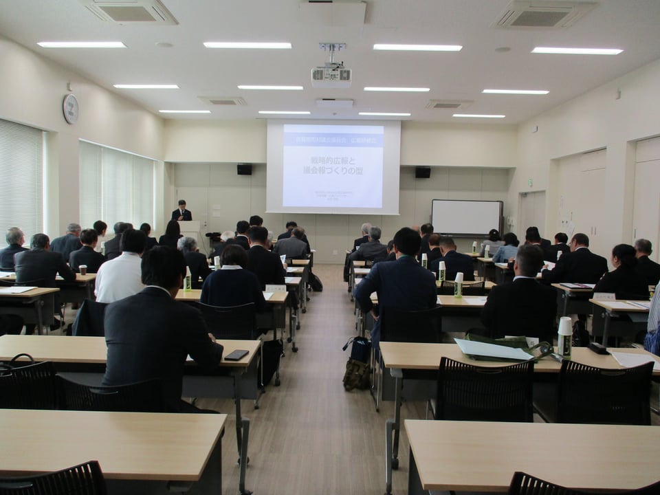 講師には広報アドバイザーの金井茂樹氏をお招きし、「戦略的広報と議会報づくりの型」をテーマに、SNS等の広報戦略や議会報の型・表現、入賞作品から学ぶ表現等について御講演いただいた。