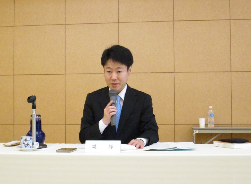 研修会では全国町村議会議員互助会部長の三宅達也氏から「町村議会の保険事業について」をテーマに、団体補償制度や、団体医療保険等について御説明いただいた。